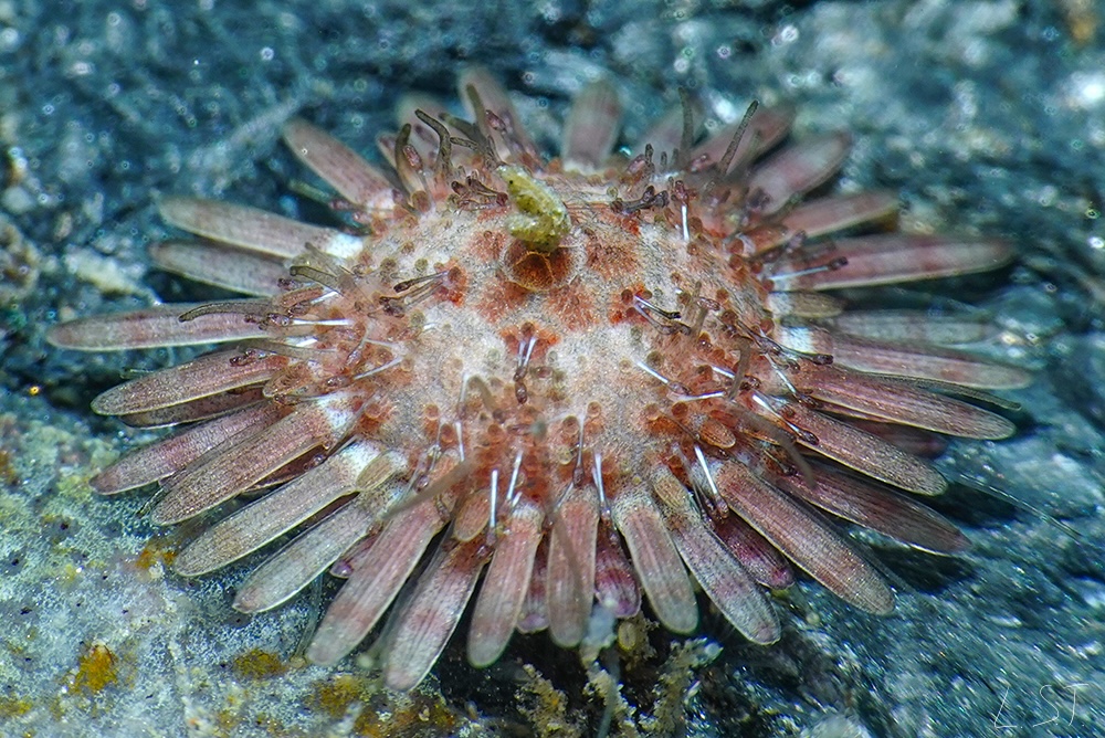Las púas son relativamente largas, al menos tanto como la mitad del diámetro del caparazón y éste es menos alto que la mitad del diámetro del mismo. Color violáceo oscuro, casi negro. Especie observada desde la línea de marea hasta - 30 m de profundidad.