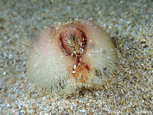 Cuerpo un poco más largo que ancho. Los poros del ambulacro anterior se disponen de forma uniseriada. Periprocto ovalado con el eje transversal de mayor longitud. Pétalos posteriores con al menos doce pares de poros. Pedicelarios globíferos rojos.