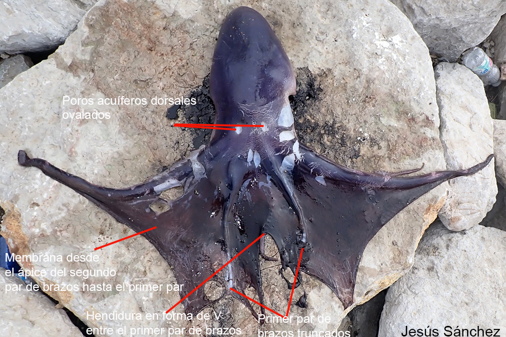 Cuerpo de hasta 1 m de longitud en las hembras y unos 40 mm en los machos. Brazos con dos filas de ventosas y desiguales, En las hembras, entre el primer par de brazos hay una membrana que llega hasta el ápice de los mismos y con una hendidura en la parte central en forma de V. La membrana se extiende también entre el primer par de brazos y el ápice del segundo par de brazos.