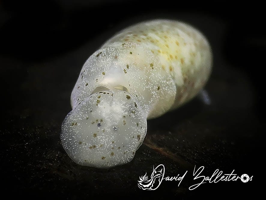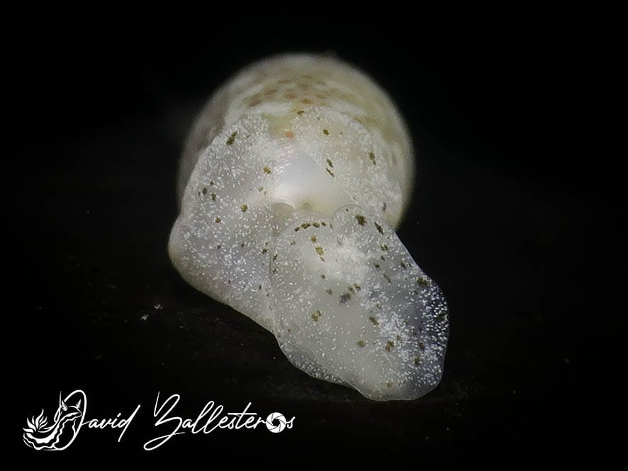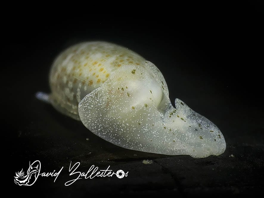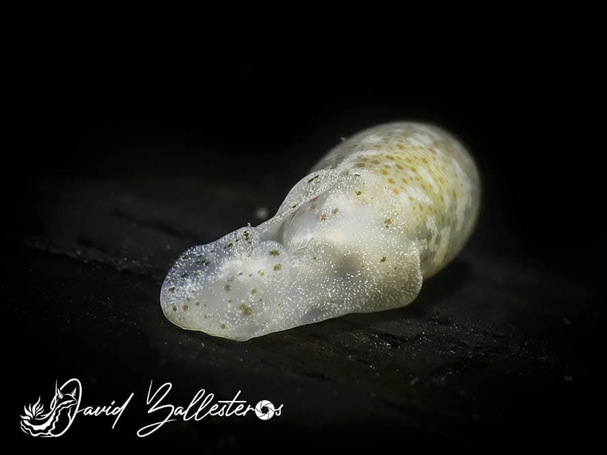 Cefalaspideo de hasta 8 mm de longitud. El disco cefálico es pequeño y bilobulado posteriormente. La concha es alargada, ovoide y apenas es recubierta por el animal. Color de fondo blanquecino con manchas gruesas pardo rojizas. (Gofas et al. 2011)