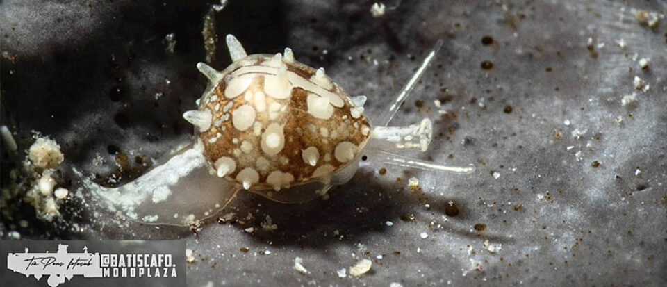 La concha es pequeña, piriforme, rechoncha y de superficie lisa. La última vuelta envuelve todas las anteriores, incluido el ápice. El extremo abapical de la abertura es poco prominente, lo que la diferencia del resto de congéneres. Columela con cuatro pliegues en la parte inferior. Labio grueso y con dentículos. Color blanco translúcido. El color del manto externo está formado por unos círculos blanquecinos de los que parten en su parte central un tubérculo alargado del mismo color, manchas naranjas, verdes y negras. Vive entre algas en el piso infralitoral. (Gofas et al., 2011)