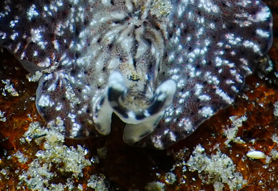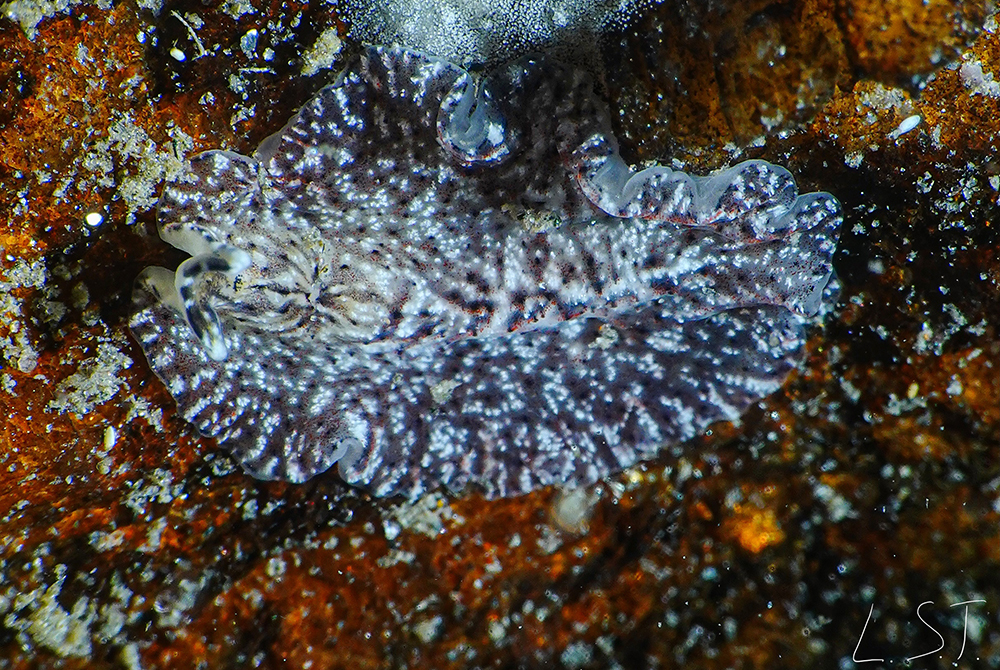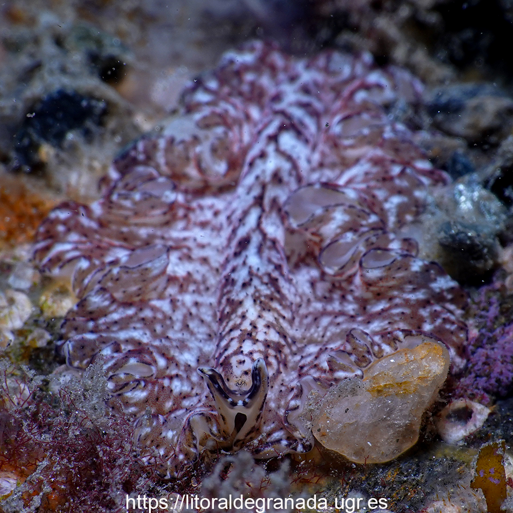 La superficie dorsal es lisa, de color marrón oscuro. El color oscuro de fondo está interrumpido por manchas blanquecinas dispersas, más concentradas en la línea central del cuerpo, la cual se encuentra elevada. La cara ventral es de un tono lechoso. La faringe es de tipo plegada, estrecha y lobulada. Observada debajo de piedras, se trata de una de las especies de Pseudocerotidae con mayor tamaño en nuestras costas.